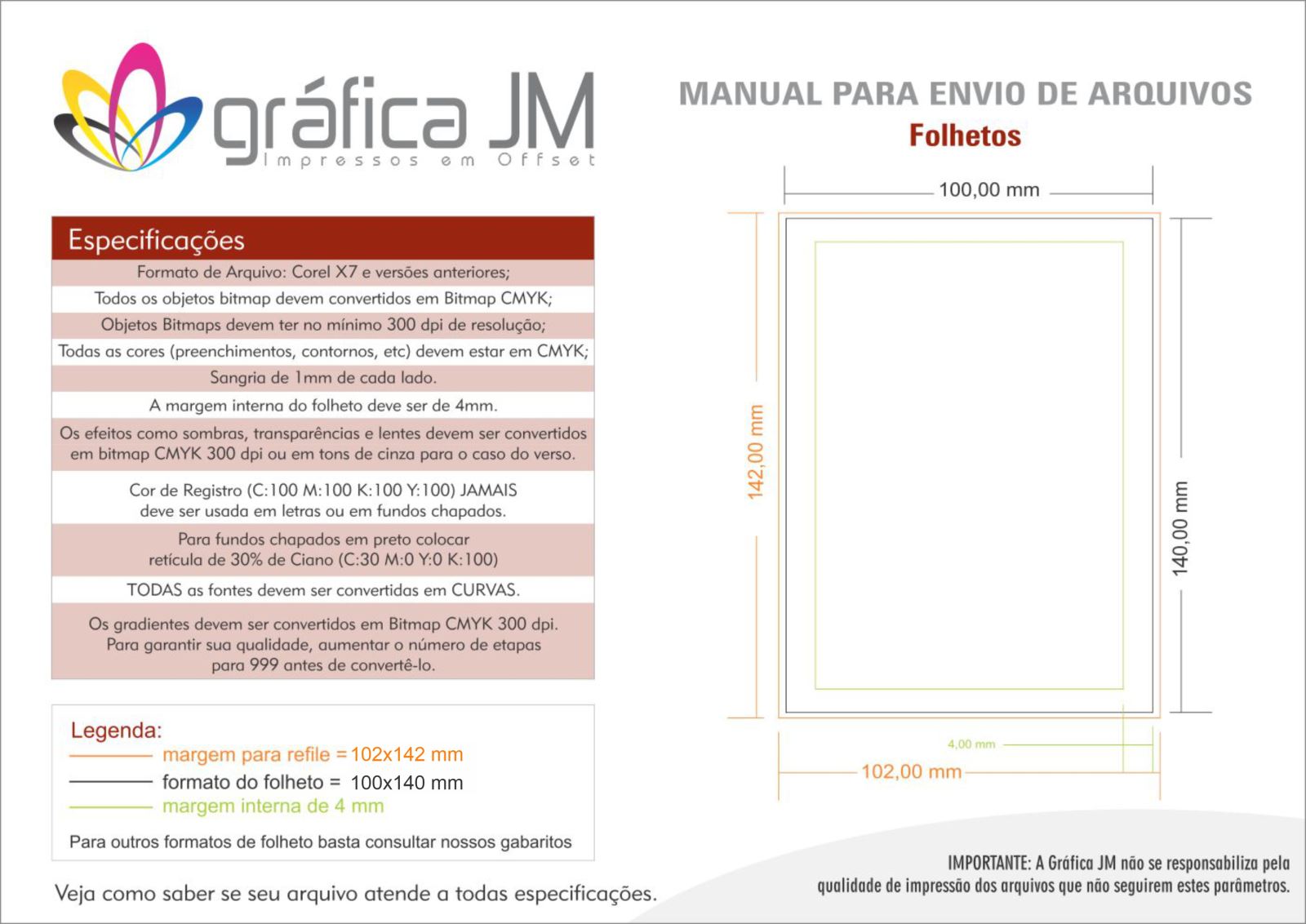 A GRÁFICA JM NÃO SE RESPONSABILIZA POR ERROS NOS MATERIAIS, OCASIONADOS POR ARTES QUE NÃO SEGUEM RIGORAMENTE AS INSTRUÇÕES DE NOSSOS MANUAIS E GABARITOS.